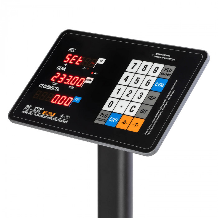На выносной стойке установлен LED-дисплей. Экран закреплен на металлическом основании. Это повышает прочность конструкции. На табло предусмотрено 16 разрядов индикации. Размер цифр: 8*14 мм. Дисплей показывает массу товара, цену за 1 кг, стоимость покупки, сумму сдачи. Можно регулировать наклон табло, чтобы прочитать цифры при любом освещении.