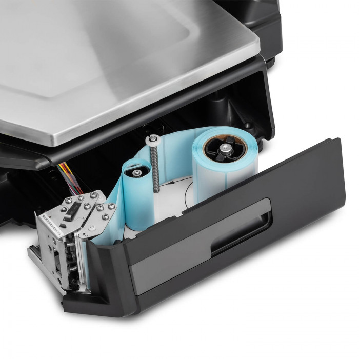 Модель отличается эргономичным и продуманным расположением узлов. Печатающий механизм располагается под платформой. Встроенный принтер работает по принципу термопечати. Ширина зоны печати составляет до 54 мм, а длина этикетки до 90 мм. Время печати наклейки составляет не более 1 секунды.