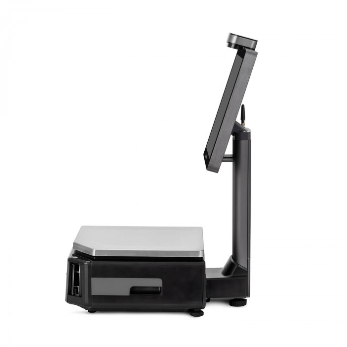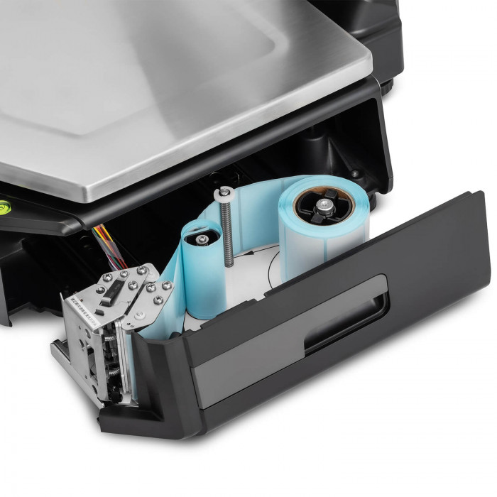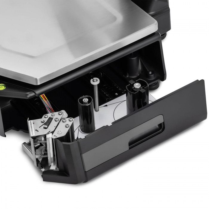 Встроенный принтер работает по технологии термопечати. Он печатает в разрешении до 203 DPI. Ширина рабочей области составляет до 54 мм, а длина — до 90 мм. Шаблон печати легко можно настроить с учетом специфики магазина. Готовые этикетки отрываются с минимумом усилий.